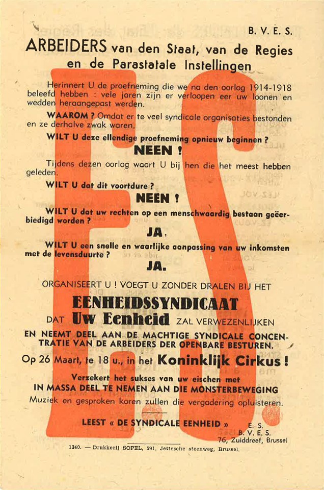 De Tweede Wereldoorlog betekende een ingrijpende omwenteling voor de toenmalige organisaties van sociale partners. De Duitse bezetter ontbond bestaande structuren, richtte nieuwe organisaties op en schortte het sociaal overleg op. De expo toont hoe de sociale partners omgingen met de moeilijke sociale omstandigheden van de oorlog, waaronder de verplichte tewerkstelling van werknemers in Duitsland. Daarbij worden ook de centrale figuren van het sociaal verzet in de kijker gezet.Tegelijkertijd werkten de sociale partners, vaak in het geheim, aan een visie voor het naoorlogse sociaal overleg en de uitbouw van de sociale zekerheid. De tentoonstelling vertelt ook dit verhaal en belicht de belangrijkste protagonisten.