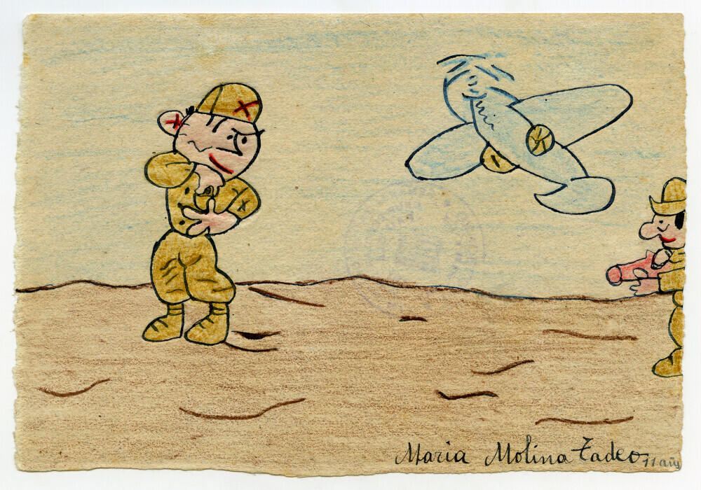 Voor deze expo stelde Amsab-ISG replica’s ter beschikking van een bijzondere reeks kindertekeningen uit de eigen collectie. De tekeningen werden gemaakt door Spaanse kinderen die tijdens de burgeroorlog uit oorlogsgebieden werden geëvacueerd en via solidariteitsacties van de socialistische beweging in Belgische gastgezinnen werden opgevangen. Ze vormen een aangrijpend en persoonlijk getuigenis van de oorlog, gezien door de ogen van de jongsten.