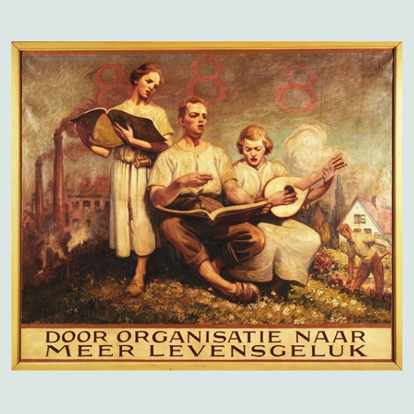 Het schilderij, waarop we een jonge man en twee jonge vrouwen zien die zingen en musiceren, staat niet alleen voor het inkorten van de werkdag tot acht uur, maar ook voor het invullen van de andere uren. Naast de acht uur rust moest de arbeider tijd krijgen om zichzelf te ontwikkelen en te ontplooien. Vanaf het einde van de 19e eeuw richtte de socialistische beweging allerlei culturele verenigingen, toneelkringen, zangkoren, fanfares, leesclubs, turnclubs enz. op, met als gezamenlijk doel de emancipatie van de arbeider. Een emancipatie, waarin ook het verplicht onderwijs een belangrijke plaats innam, die de arbeider een beter leven moest bieden en hem/haar tegelijk klaarstomen om volwaardig deel te nemen aan het maatschappelijk leven.