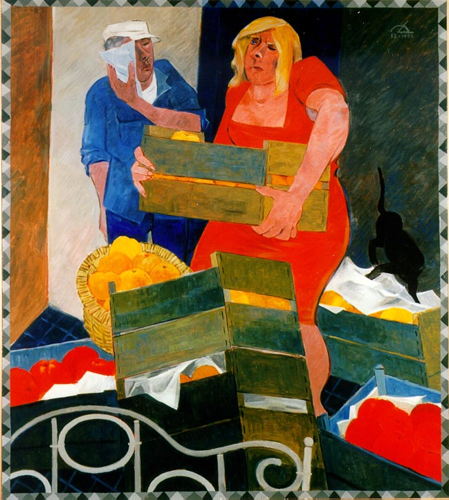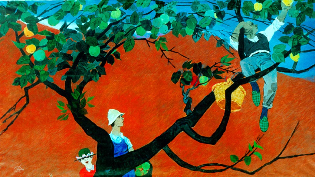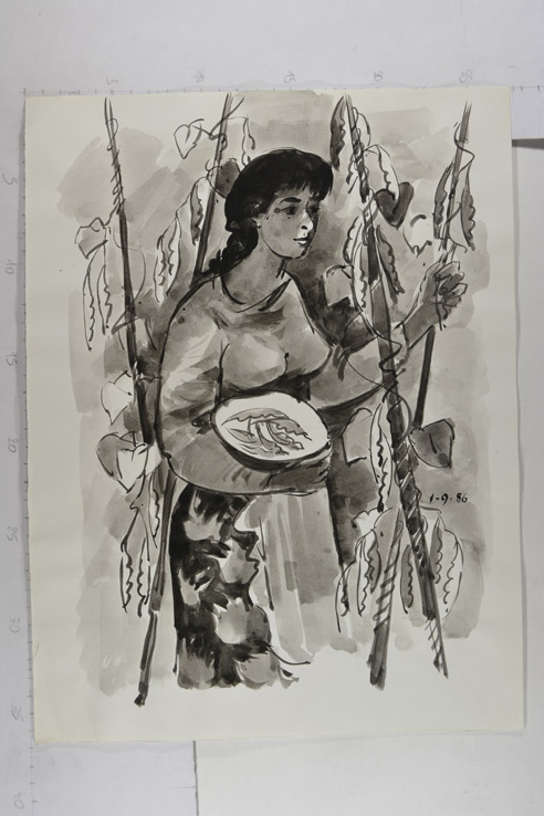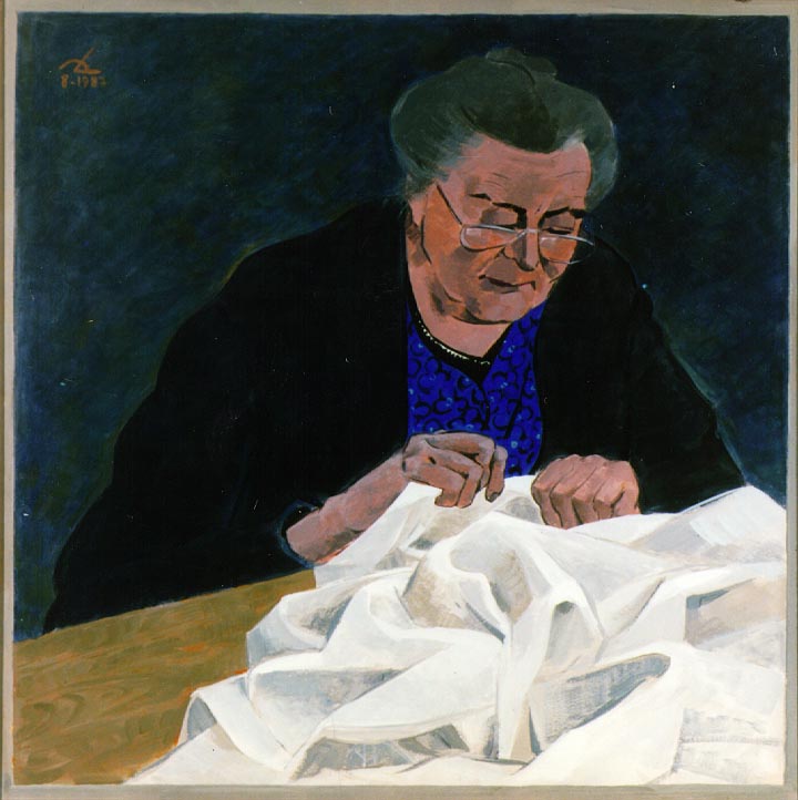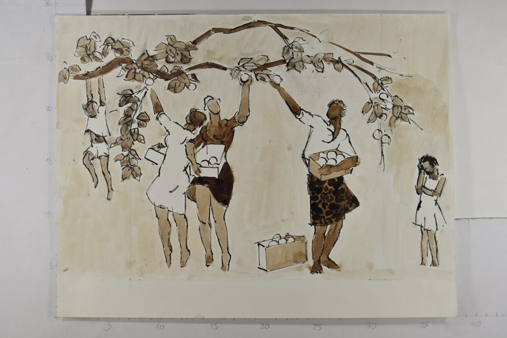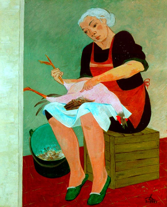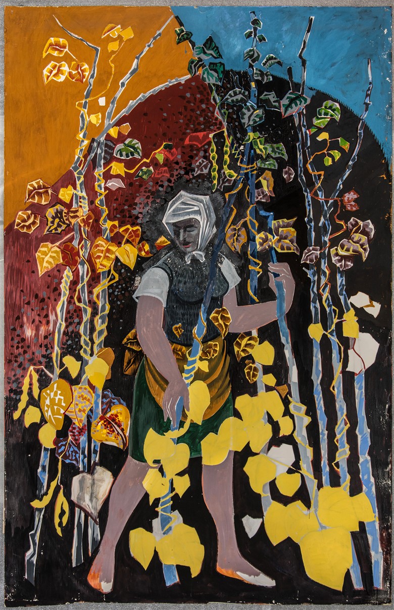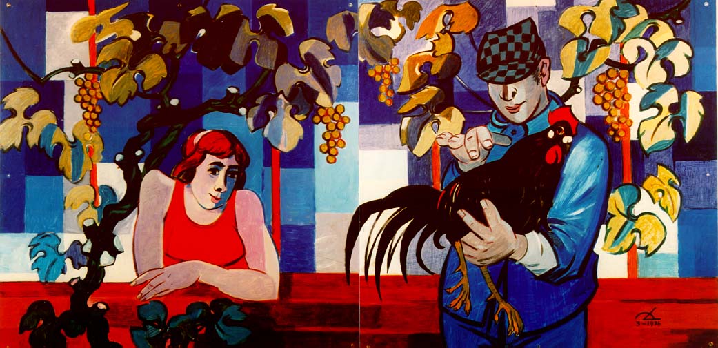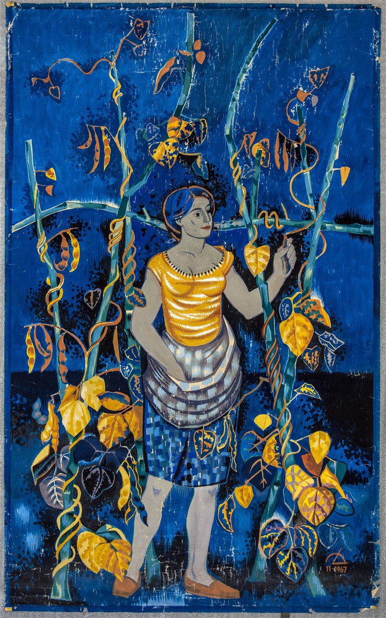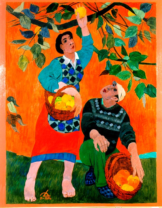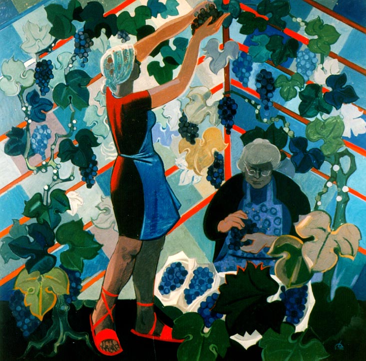 Louis Deltour - Schilderij van een oude en een jonge vrouw, beiden druiven aan het plukken. 1970
