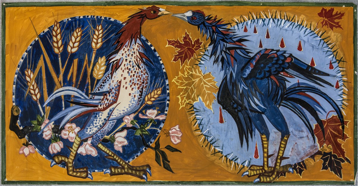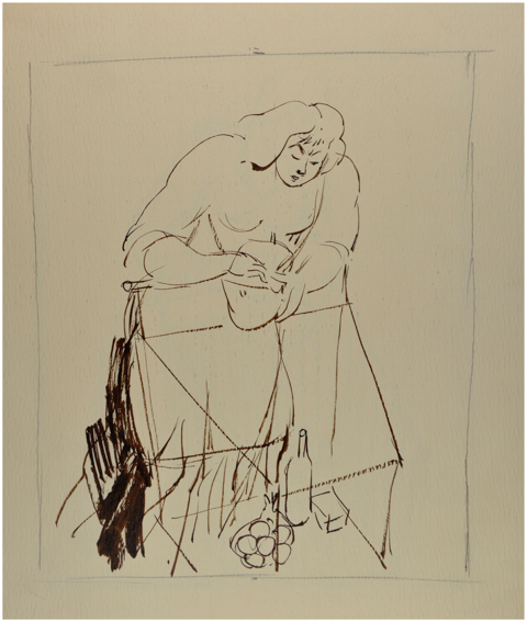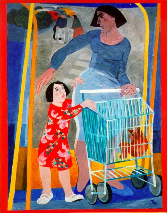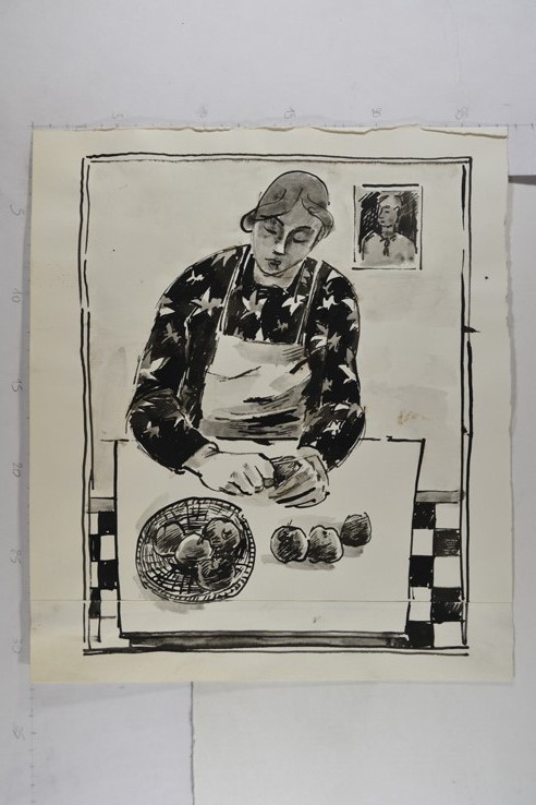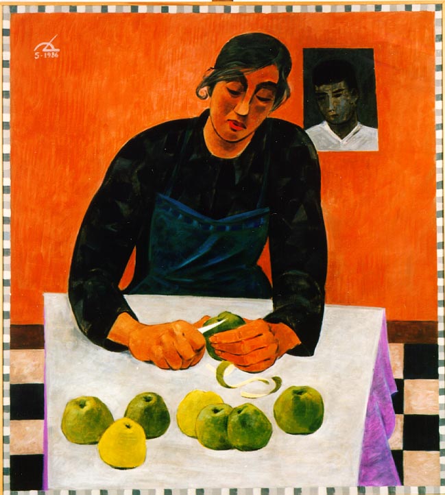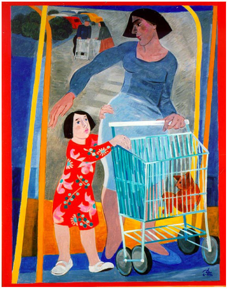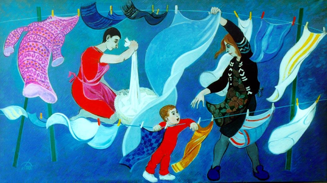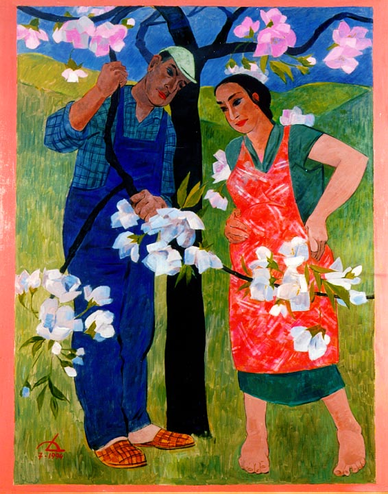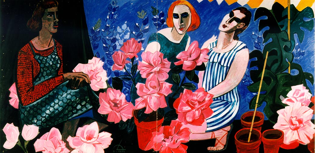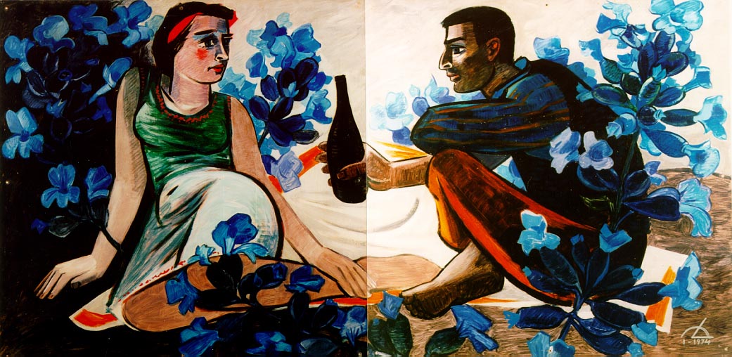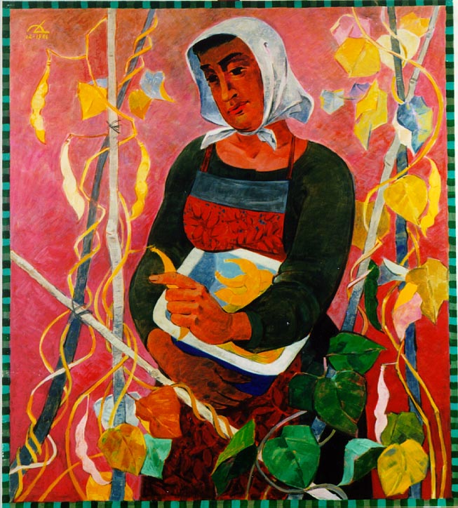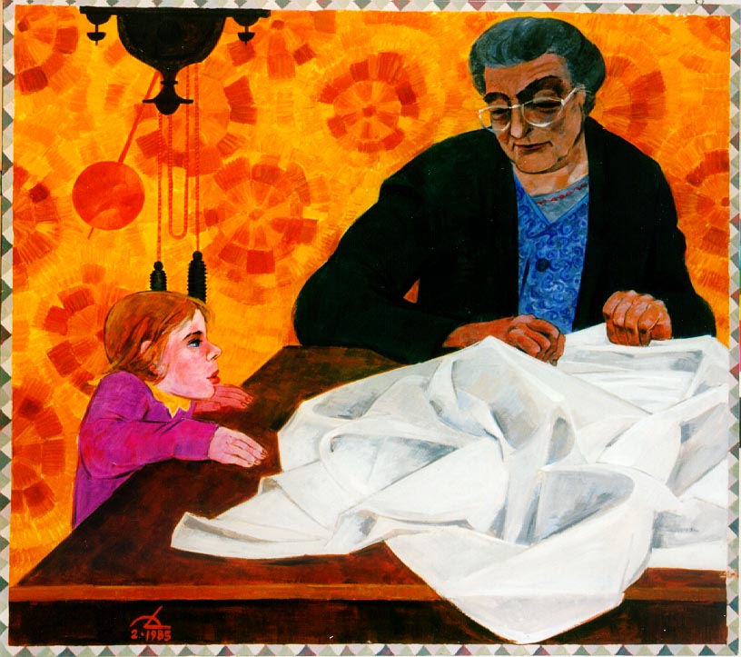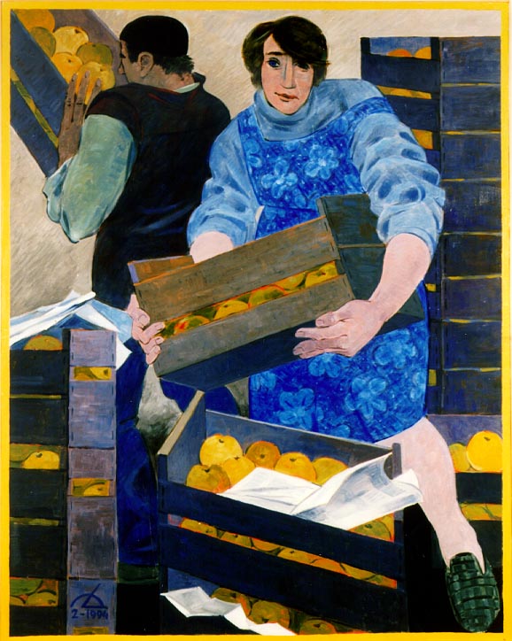 Louis Deltour - Schilderij van een oude en een jonge vrouw, beiden druiven aan het plukken. 1970