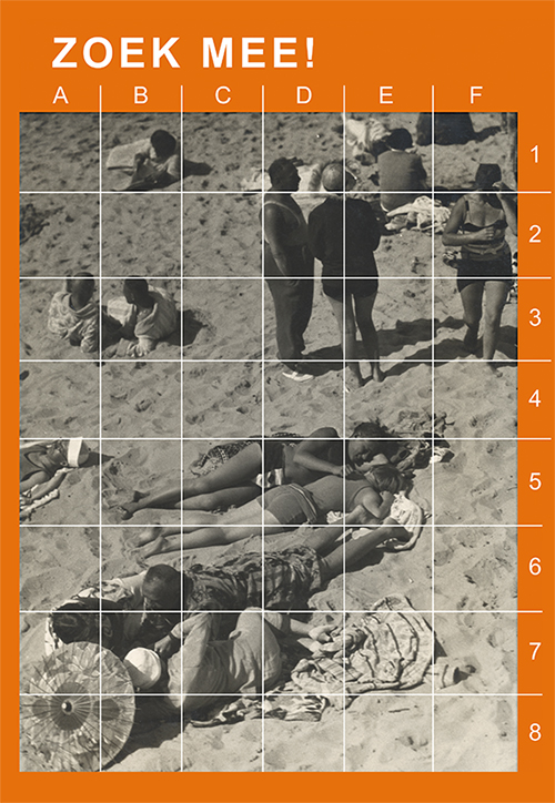 Bestudeer de zomerse strandfoto van Studio Stone. Zie jij waar het puzzelblokje thuishoort? Noteer dan onder de foto de letter en het cijfer van het juiste vakje.