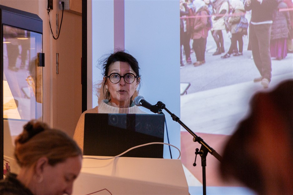 Martine Vermandere, coördinator publiekswerking bij Amsab-ISG, gaf een workshop over het project Welkom in Gent, waarin jonge nieuwe Gentenaars zelf bepaalden hoe ze aan de slag wilden gaan met het erfgoed van Belgische vluchtelingen in het Verenigd Koninkrijk.