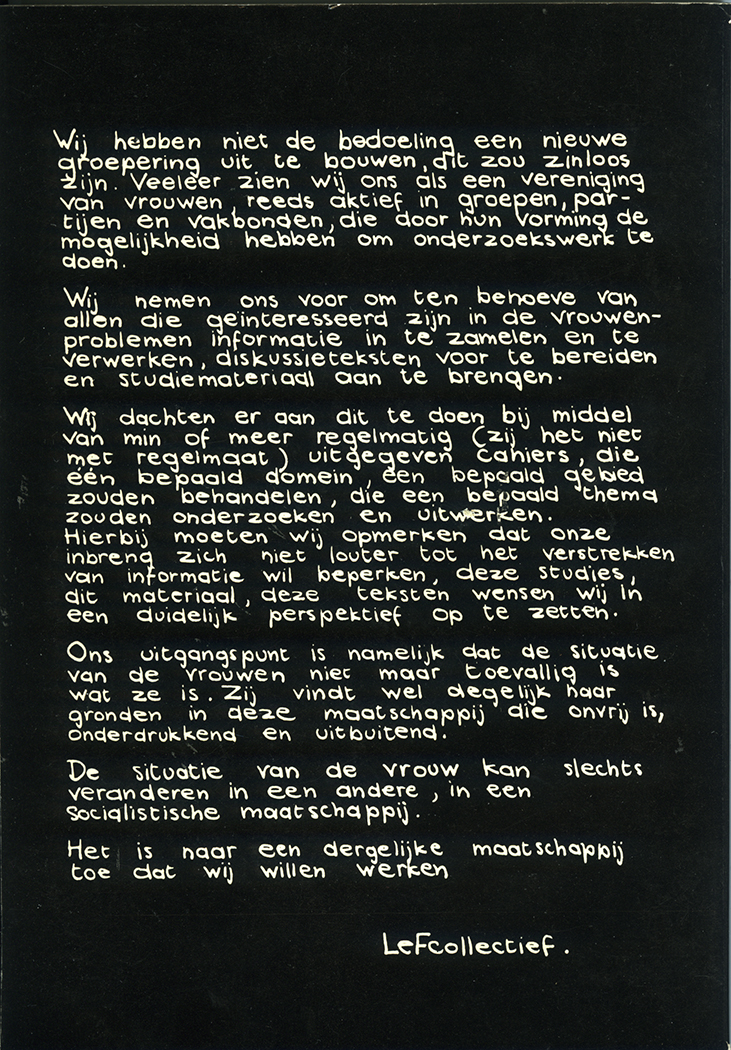 LeF was links: de situatie van de vrouwen kwam niet uit toeval voort, maar grondde in “deze maatschappij die onvrij is, onderdrukkend en uitbuitend. De situatie van de vrouw kan slechts veranderen in een andere, in een socialistische maatschappij”.