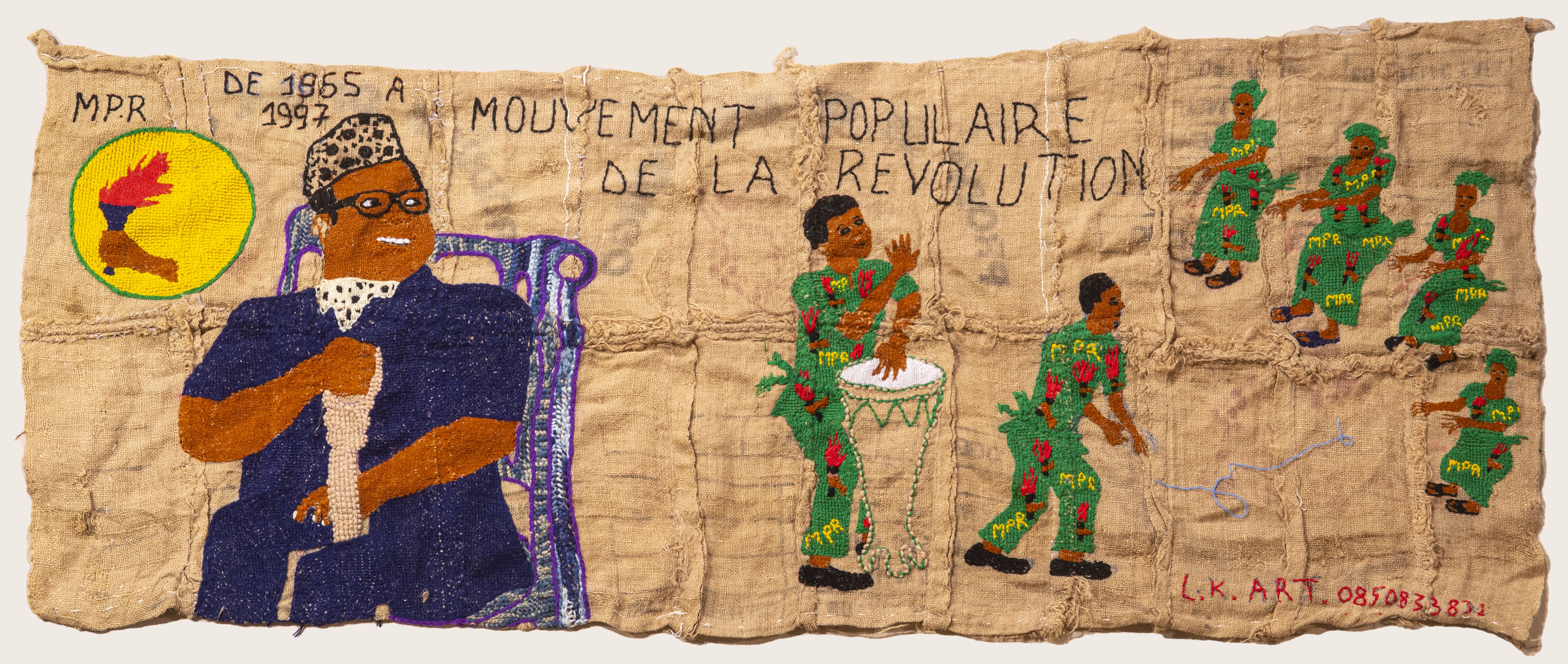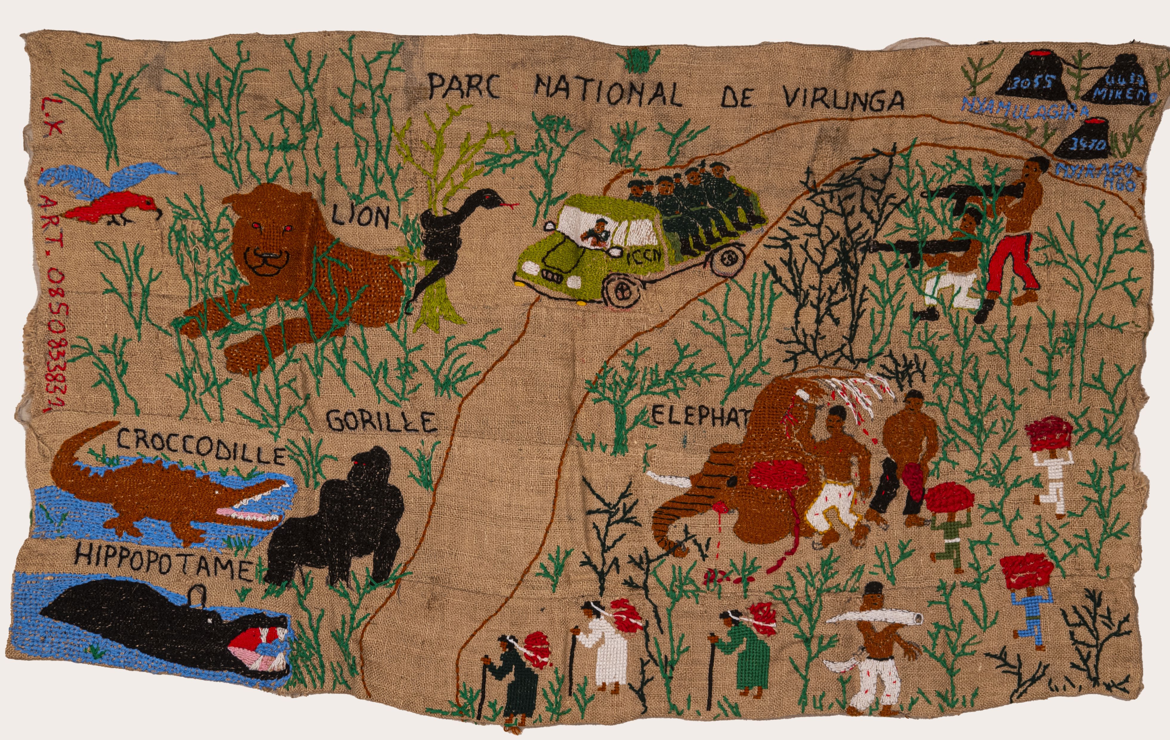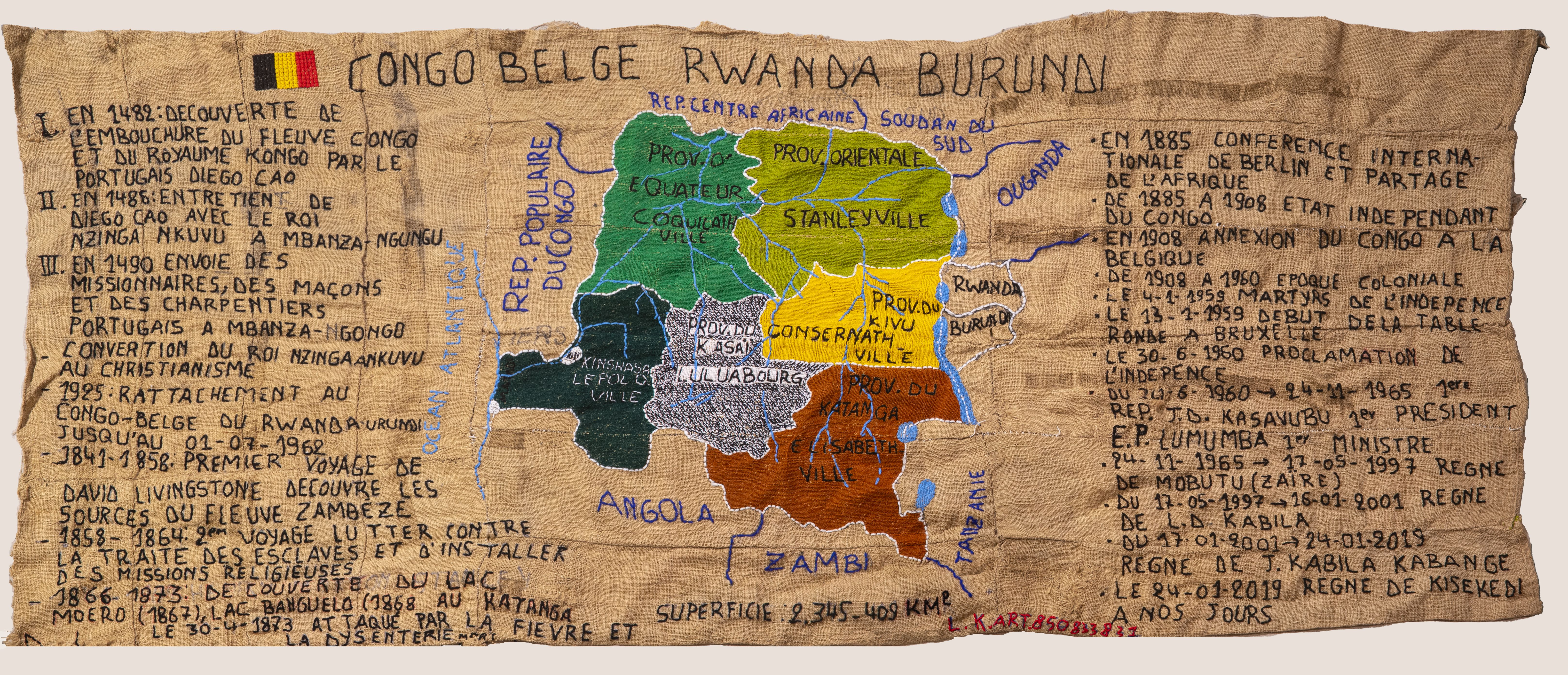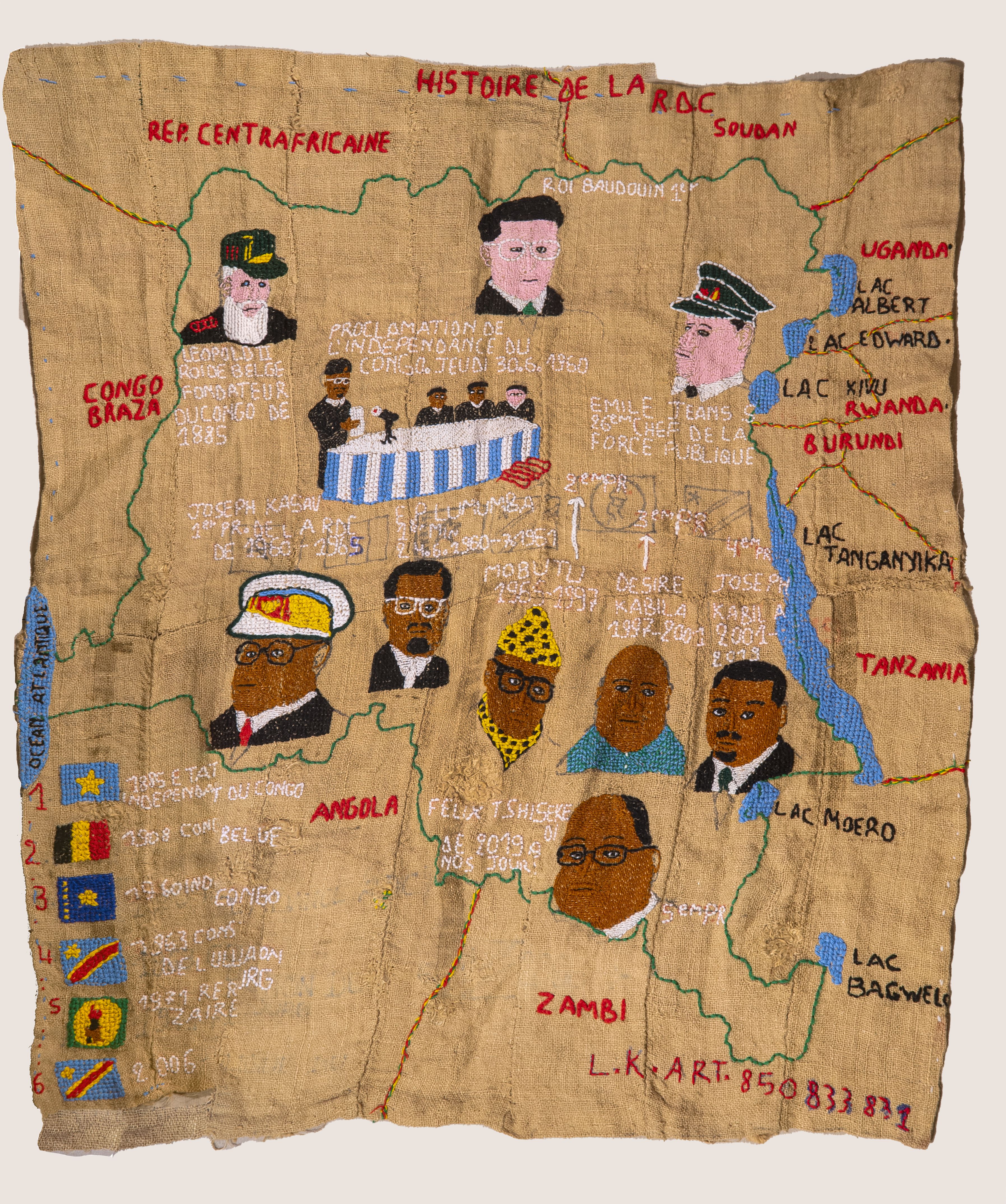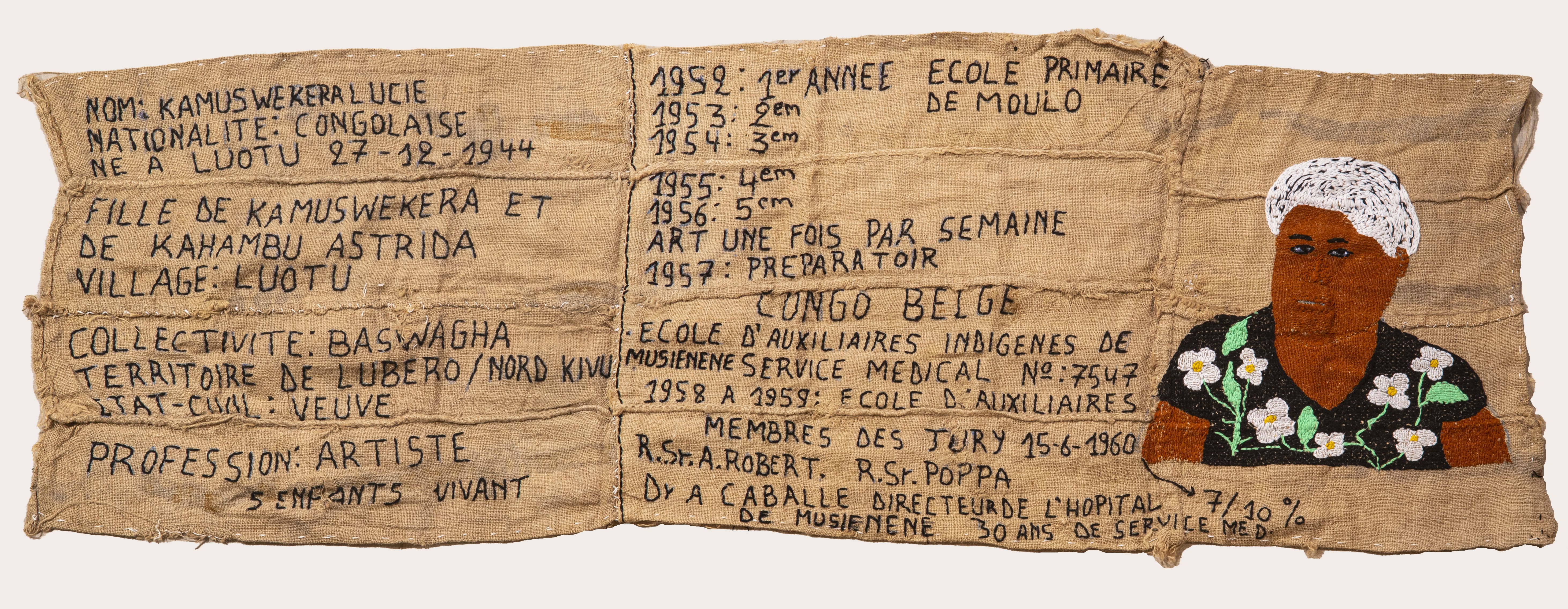 De 80-jarige kunstenares Lucie Kamuswekera woont en werkt in Goma, in het oosten van Congo. Al sinds haar jeugd borduurt ze, een vaardigheid die ze leerde van Italiaanse missiezusters tijdens de koloniale periode. Op ruwe jutezakken verbeeldt ze de geschiedenis van haar land – van kolonisatie tot het heden – met indrukwekkende taferelen van geweld, onrecht en verzet. Haar werk is zowel kunstzinnig als historisch: een tastbaar geheugen van Congo’s pijnlijke en complexe verleden.